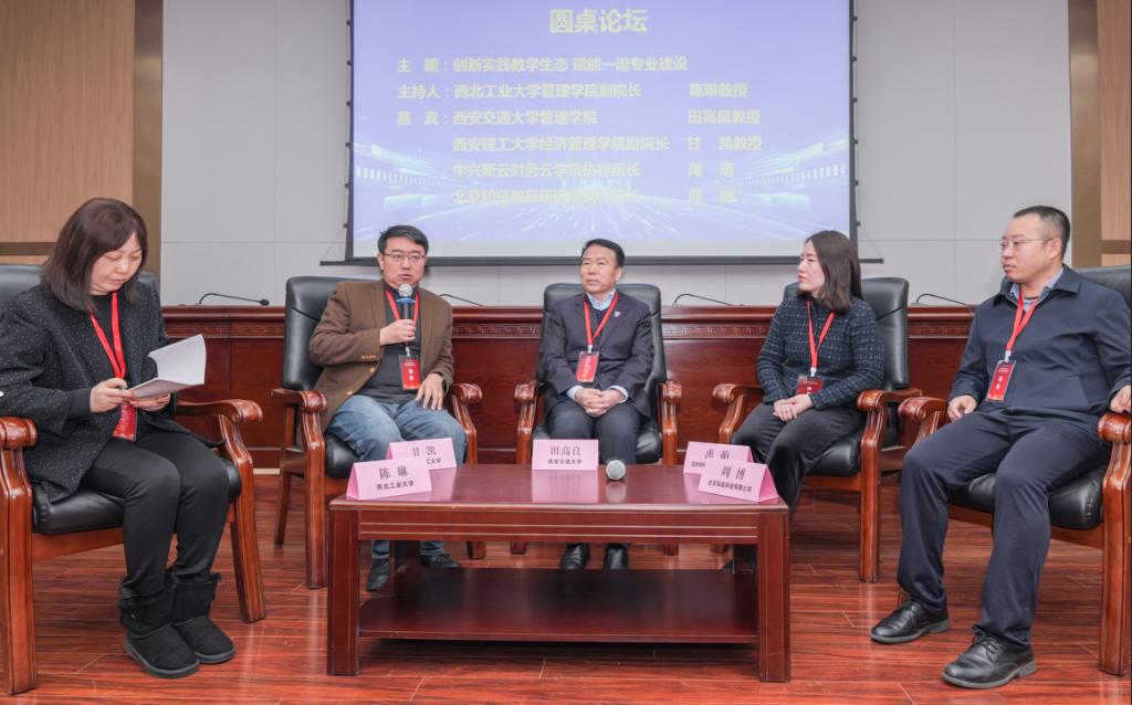 副院长甘凯、中兴新云财务云学院执行院长禹萌、北京知链教育研究院执行院长周博出席圆桌论坛,五位专家围绕“创新实践教学生态,赋能一流专业建设”主题进行了充分交流与讨论。