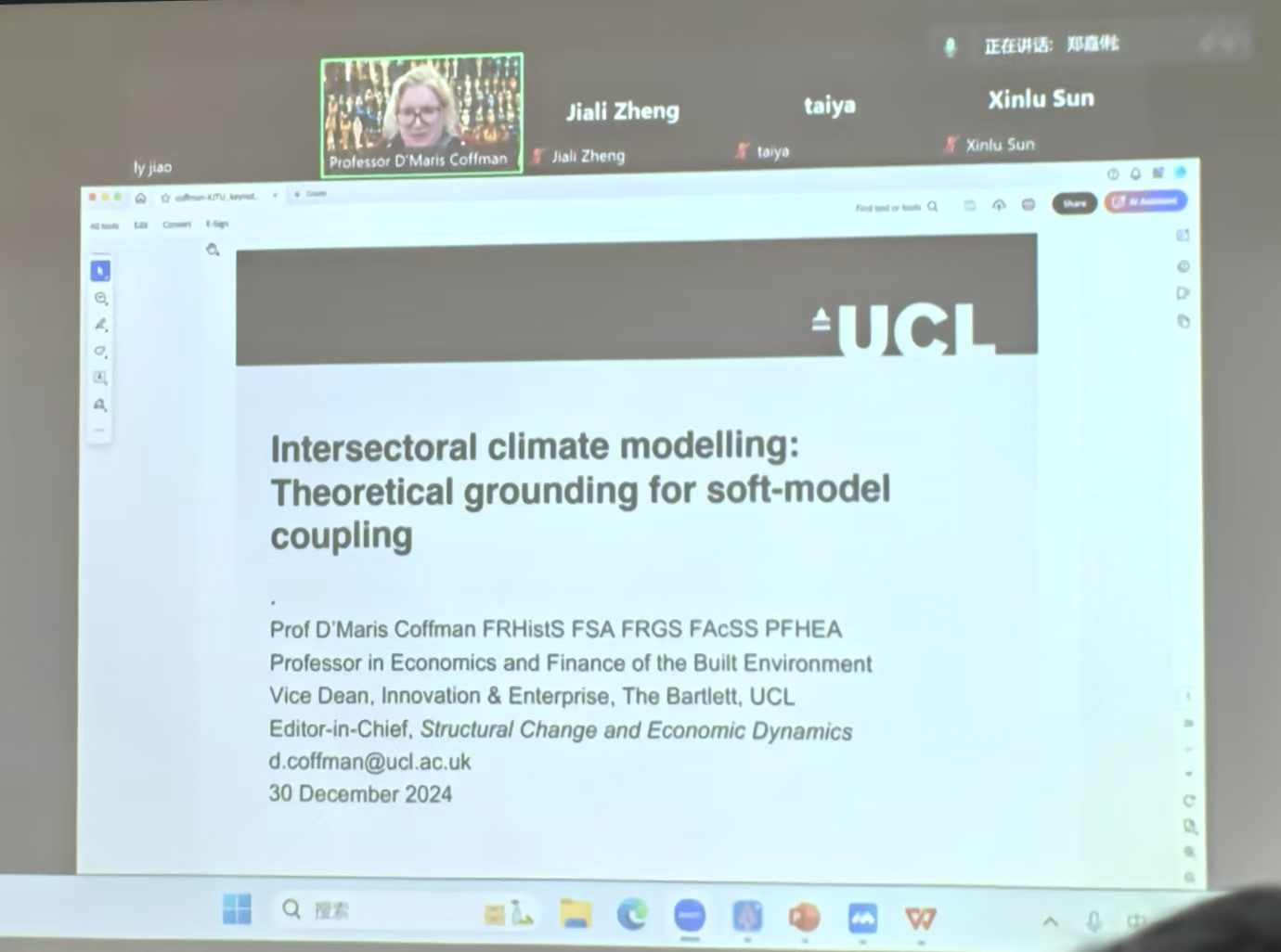 英国社会科学院院士、UCL巴特莱特学院副院长、SCED期刊主编D'Maris Coffman教授进行了《Deep Decarbonisation and Structural Change: New Approaches and Challenges》为主题的特邀专场报告。D'Maris Coffman教授详细介绍了模型耦合的理论基础,强调了它在模拟不同经济部门之间相互作用和反馈机制时的优势,阐述了跨部门气候模型在深度脱碳和结构性变革中的重要作用。D'Maris Coffman教授的观点不仅为低碳转型相关研究提供了新的视角,也为实践中政策的制定和实施提供了宝贵的参考。分享结束后同学们对报告主题产生了浓厚的兴趣,就模型耦合、期刊发表等问题与D'Maris Coffman教授进行了深入的交流,加深了同学们对报告内容的理解。