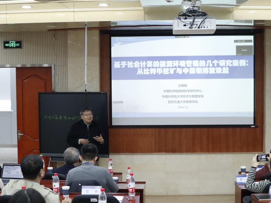 发展中国家科学院院士、中国科学院预测科学研究中心主任汪寿阳教授作了《基于社会计算的几个环境经济学研究案例:从比特币挖矿与中国碳排放谈起》的特邀讲座。讲座从社会计算概论讲起,围绕“比特币挖矿与中国碳排放和经济安全”等七个前沿案例探讨了环境经济学的多个重要议题,并基于这些案例,提出了关于碳排放政策与未来碳排放研究的深刻启示。汪寿阳教授的研究成果在包括Nature、Science在内的国际顶级期刊以及重要学术刊物上广泛发表,所提政策建议受到了政府决策部门的高度关注和重视。讲座结束后与会老师和同学就该领域前沿热点研究方向等问题与汪寿阳教授进行了深入探讨,对该领域的研究话题有了更深入的思考。